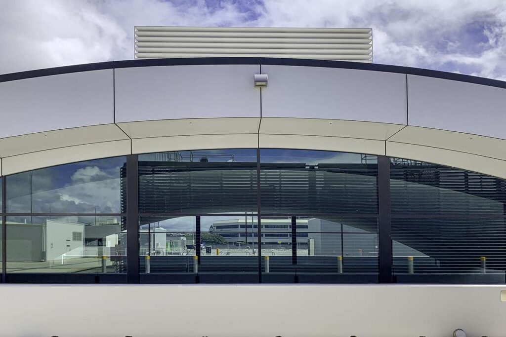 The arches to the carpark, features: – curved feature panels in Alucabond Plus in Pure White to curved skylight facia, soffit and surrounding walls